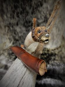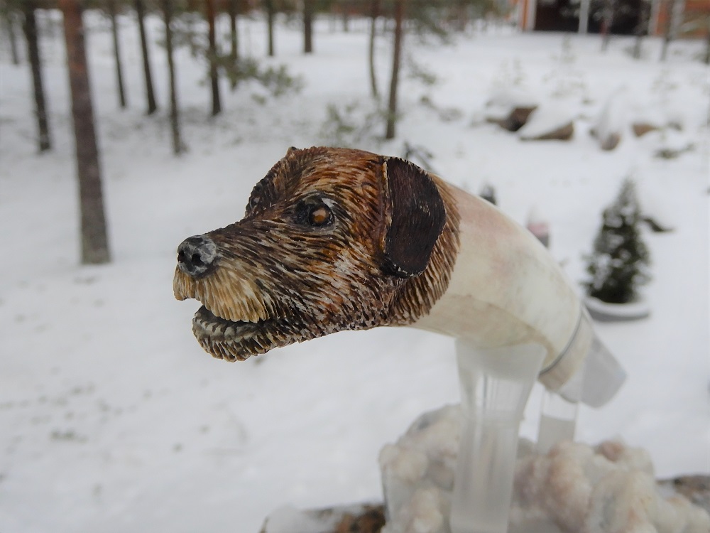 Borderterrieri kaiverrustyö hirvensarvesta silmät Tiikerinsilmää.