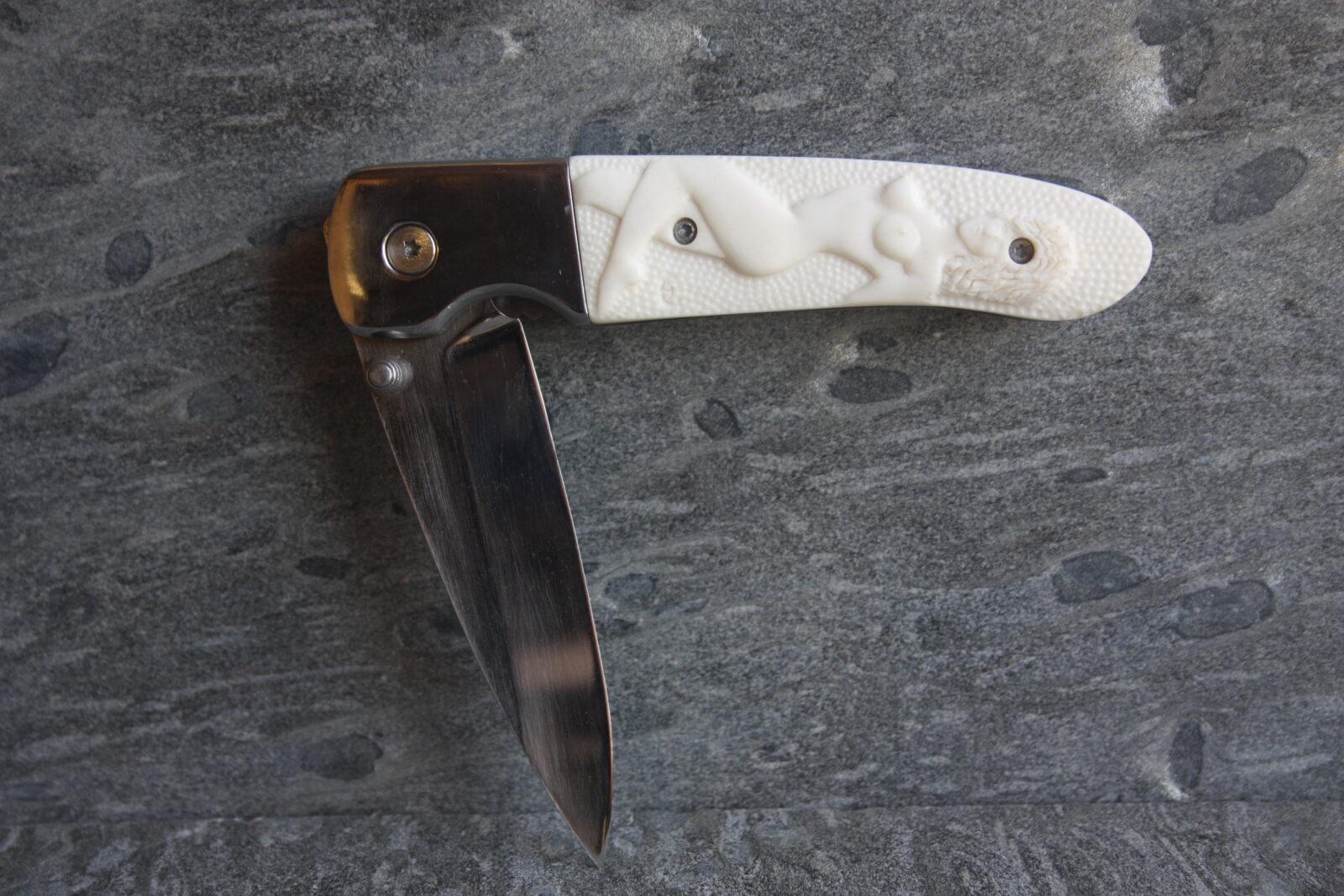 Kääntöveitsi nainen: kaiverrustyö hirven sääriluusta, terä damaskus.