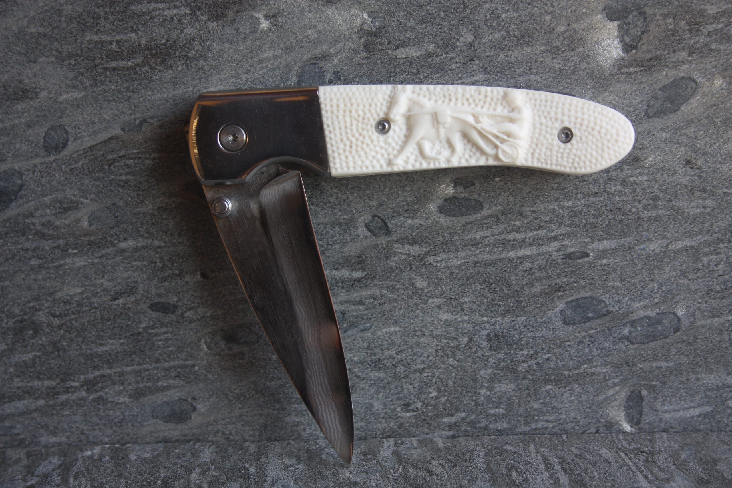 Kääntöveitsi: ravihevonen kaiverrustyö hirven sääriluusta, terä damaskus.