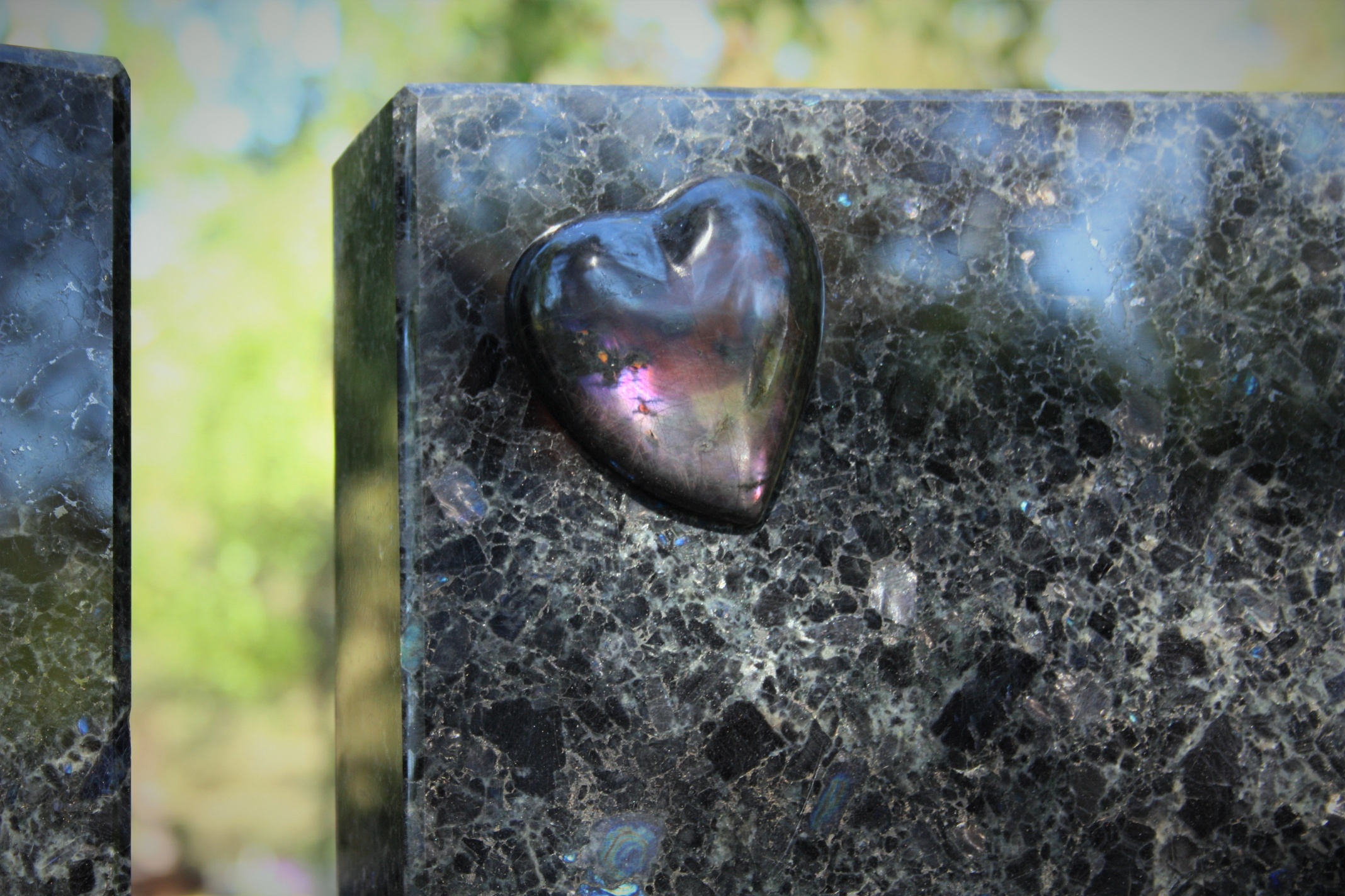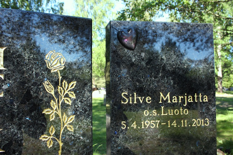 Muistokivi johon kaiversin Ylämaan spektroliitista punahehkuisen sydämmen, ajattelin että tämä sympoloi hyvin rakkaan vaimoni ja minun yhteistä harrastusta kiviin ja mineraaleihin joita keräilimme ja valmistimme koruja sekä erilaisia tuotteita ja käyttöesineitä.
