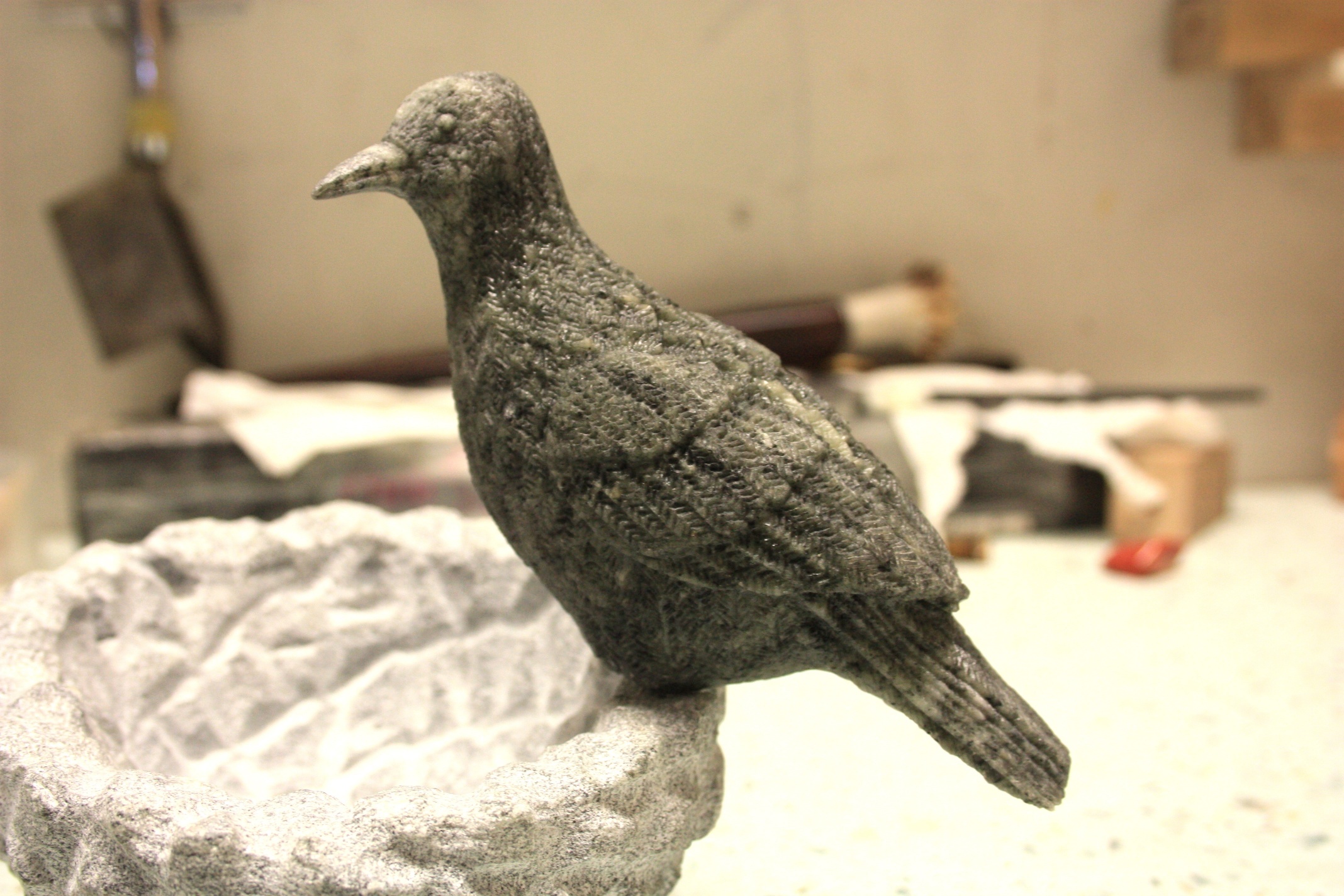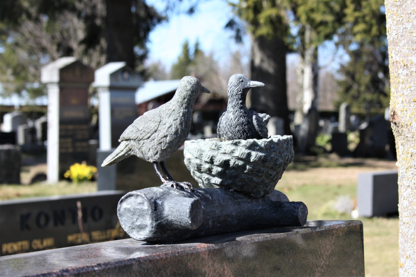 Muistopatsas: kaiverrustyö vuolukivestä, puunrunko ja linnunpesä jossa 9 munaa niin kuin meitä lapsiakin, joita” äiti lintu” hautoo, ja ”isä lintu”vartioi.