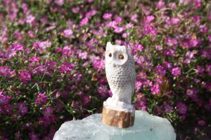 Pöllö kaiverrustyö hirvensarvesta silmät tiikerinsilmää.