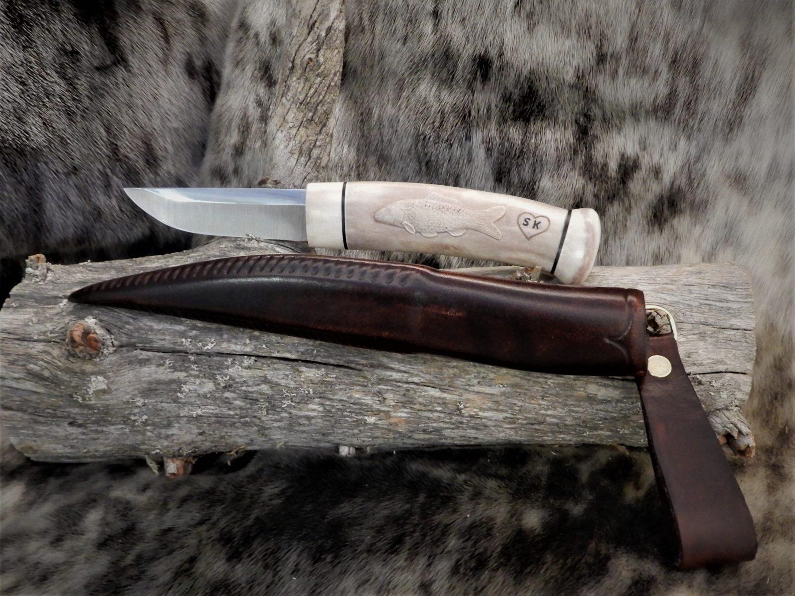Tilaustyö puukko: hirvensarvesta terä hopeateräs.