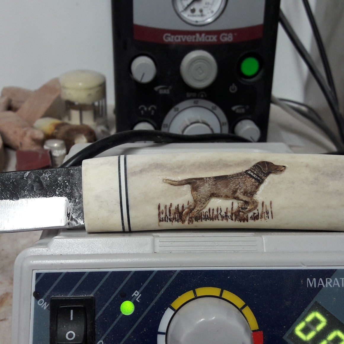 Noutaja: kaiverrustyö omasta koirasta