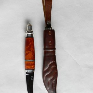 Ulkokallan majakkapuukko: hela ja majakka 925 hopeaa, kahva visakoivua terä hiiliteräs.